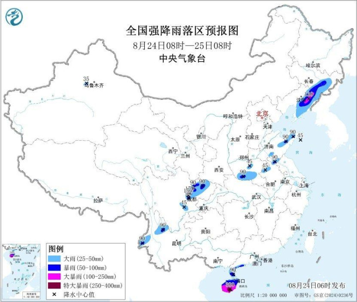 预计,8月24日8时至25日8时,海南岛、广东西南部沿海、广西南部沿海、云南西北部、四川盆地西部和北部、河南中南部、安徽北部、江苏北部、山东中部、辽宁东部、吉林东部以及新疆沿天山等地的部分地区有大到暴雨。