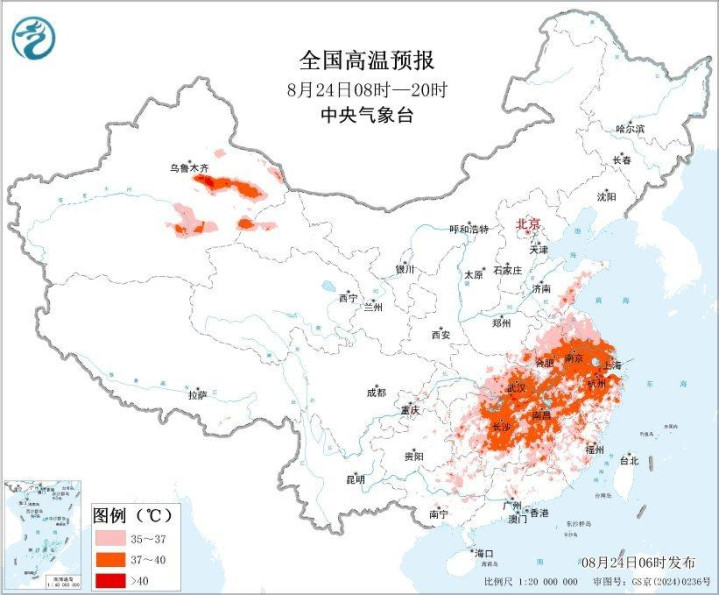 预计8月24日白天,重庆、安徽大部、江苏、上海、湖北中东部、湖南中东部、江西、浙江、福建大部、广东北部、广西北部、新疆吐鲁番盆地等地有35℃以上高温天气。